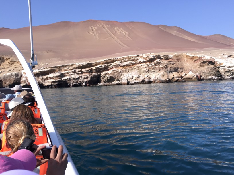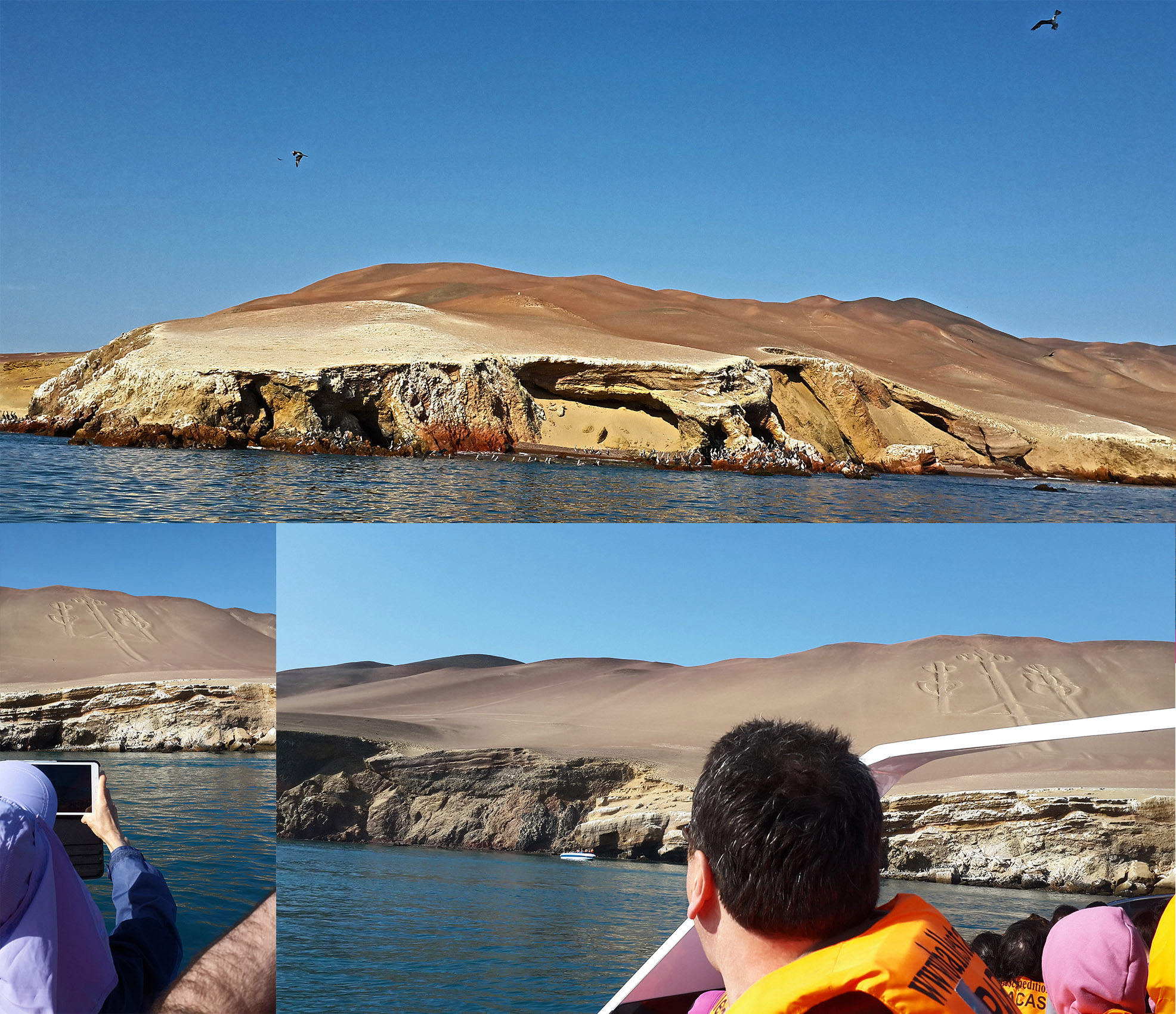 Başka turistlerle beraber bu gezi için özel tasarlanmış 20-30 kişilik teknemize binerek açılıyoruz. Koydan kurtulunca okyanus suları üzerinize serpiliyor filan ama benim gözüm yerini önceden bildiğim şamdan jeoglifi’nin bulunduğu tepede. Tekne tepenin önüne doğru yaklaştıkça bende heyecan artıyor. Nihayet burnu dönünce yandan hafifçe görünmeye başlıyor… Bütün tekne ayakta… Kimi kamerasını hazırlıyor kimi cep telefonlarını… Şaşıracak bir durum yok, ta buraya kadar gelenler mutlaka Peru gizemlerine vakıf olmuş kişiler. Tekne tam şamdan jeoglifinin karşısında duruyor. Teknenin içindeki uğultu ve hareketlilik dorukta…