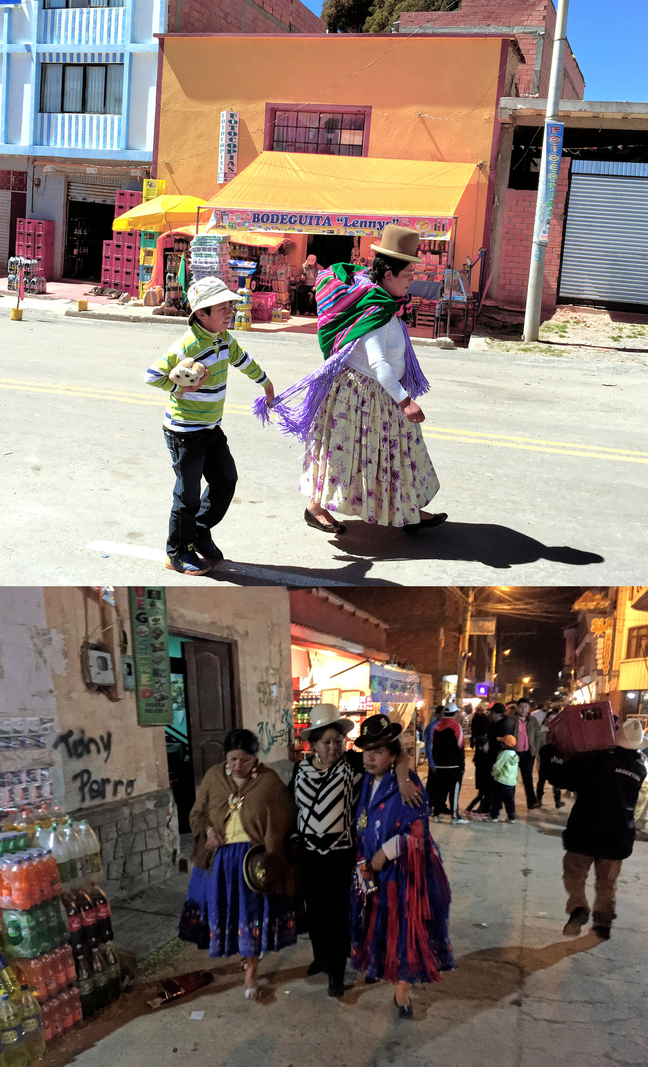 Şehir merkezine akşam girebilme fırsatı bulduk. Ben gece de yaşayan şehirleri severim, cıvıl cıvıl, ışıl ışıl bir meydan ve bu meydana açılan kalabalık sokaklar, seyyar satıcılar, müzik sesleri… Çok büyük olmasa da bir turizm kenti olmasından kaynaklanan doğal sonuç diyeceğim ama çok fazla turist görünmüyor etrafta, Bolivya’nın kendi yerel halkı… Sokaklarda rengârenk yerel giysili kadınlar, siyah takım elbiseli erkekler, hepsi çok şık… Pek çok erkek fazla içmiş, sarhoş, karsının kolunda yalpalıyor, bir iki tane içkiden yüzü gözü kaymış yerli kadın da görünüyor, her şey çok eğlenceli. Karnaval gibi. Zannediyorum hafta sonu olması bu görüntüyü ortaya çıkarıyor. Bir yerde düğün var mesela, bir başka açık eğlence alanında nişan türünden bir etkinlik… Diyorum ya mutluluk yayılıyor her yerden, biz de mutluluğun resimlerini çekiyoruz bol bol…